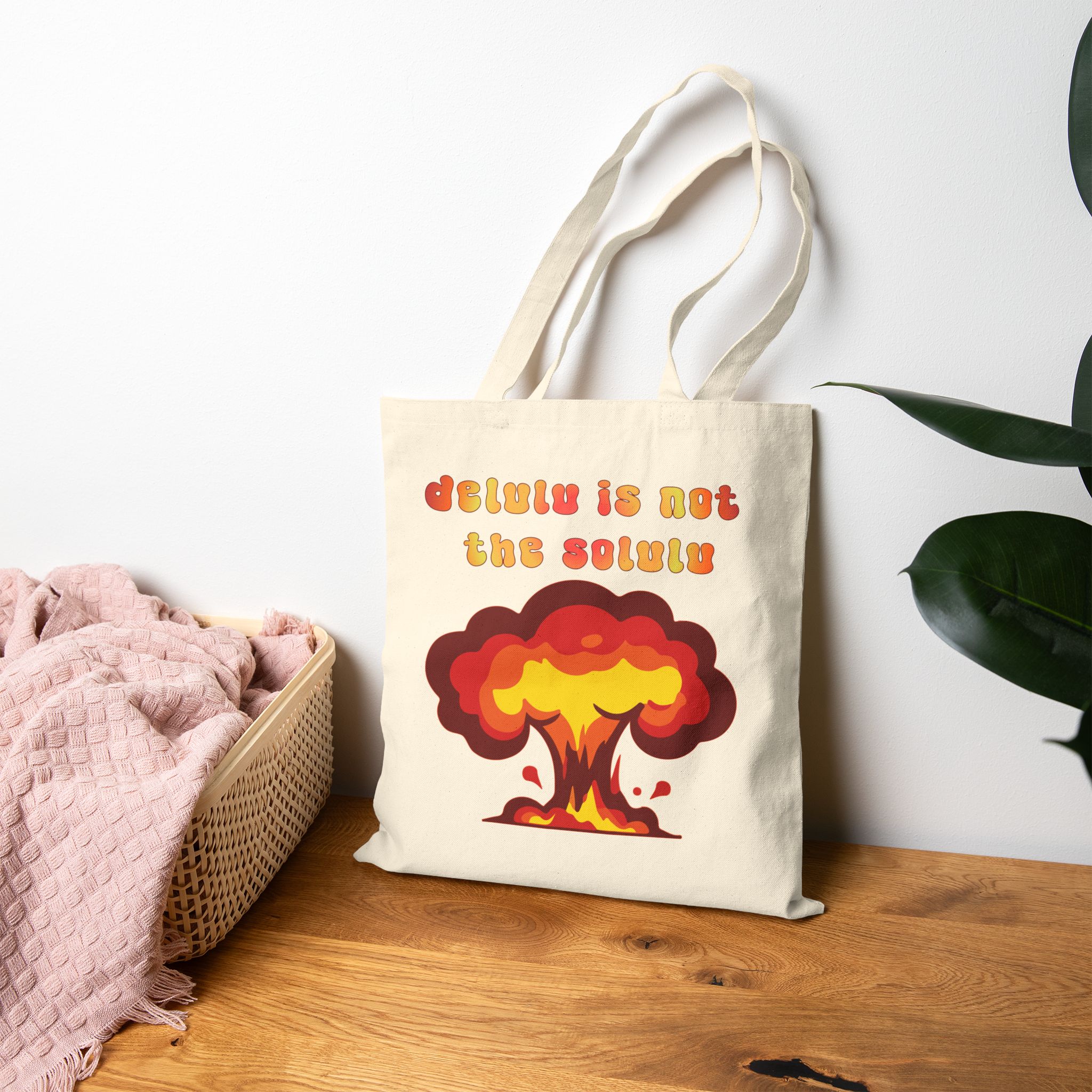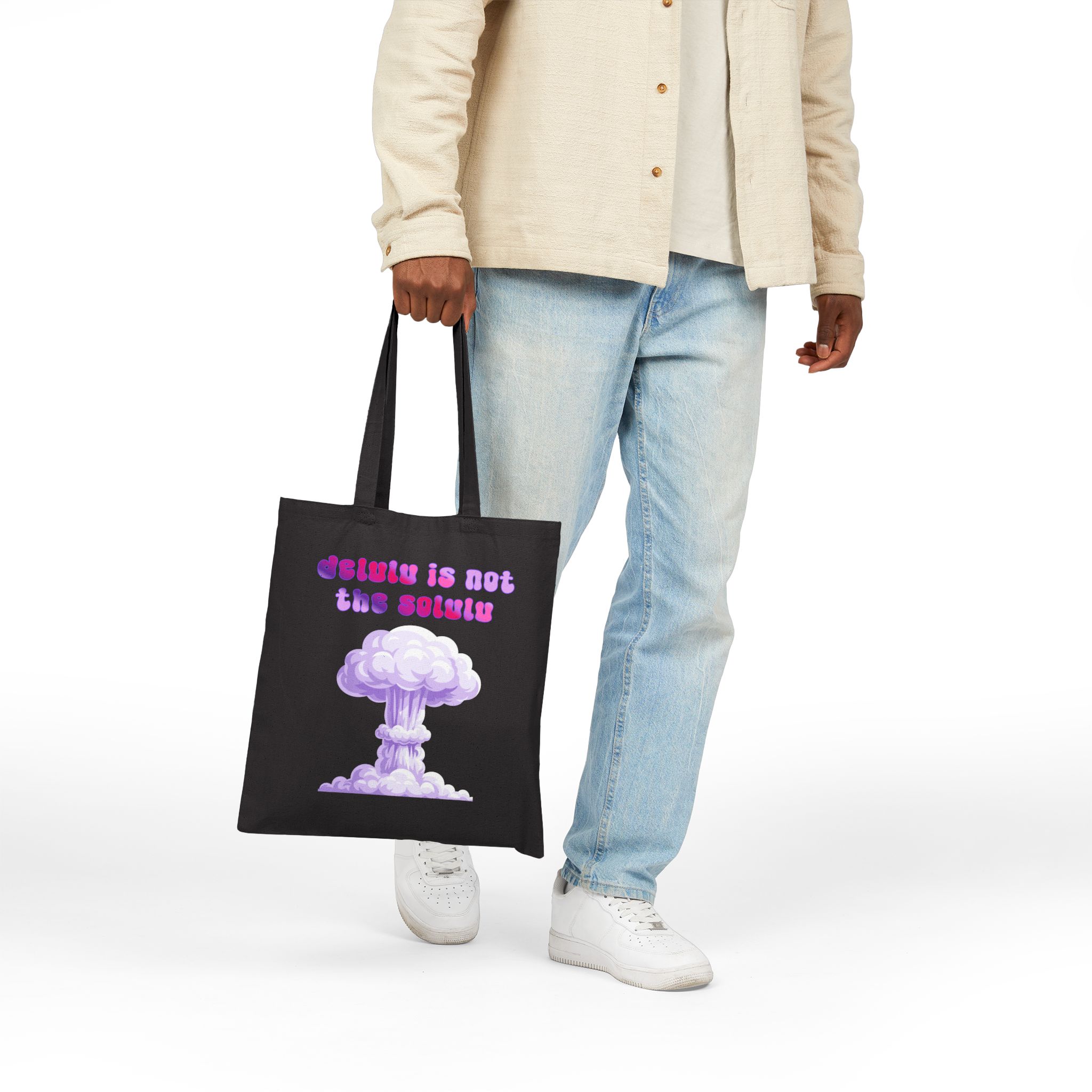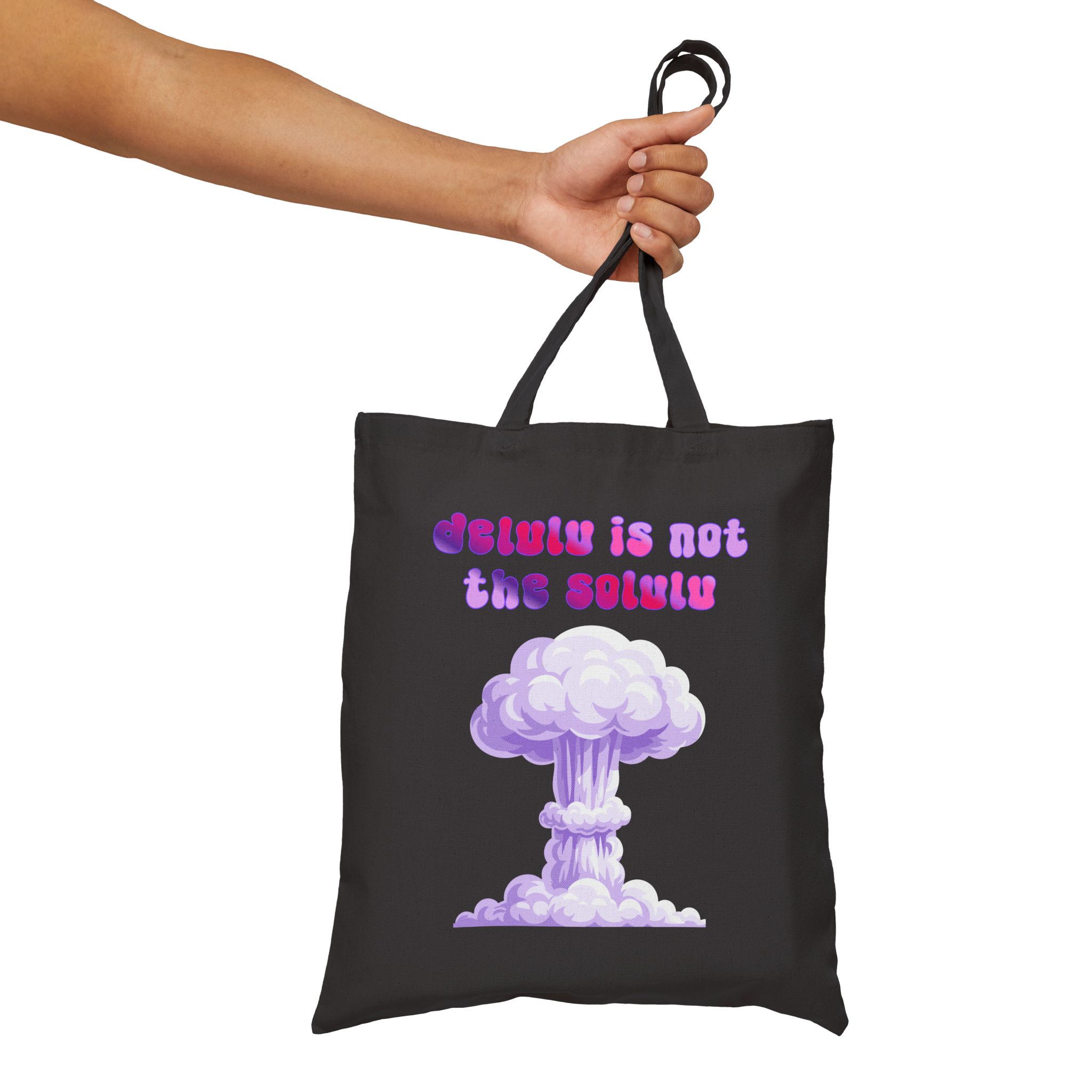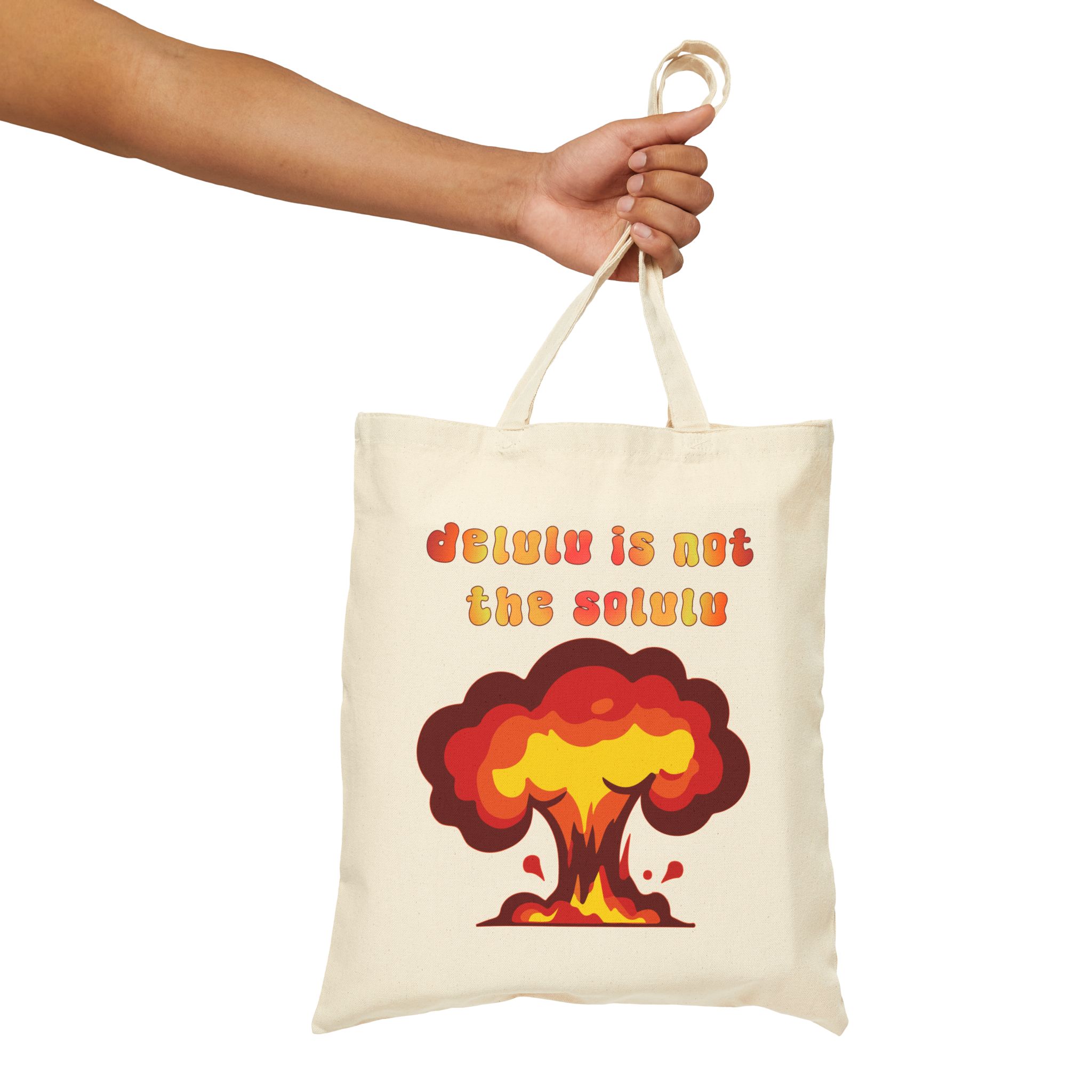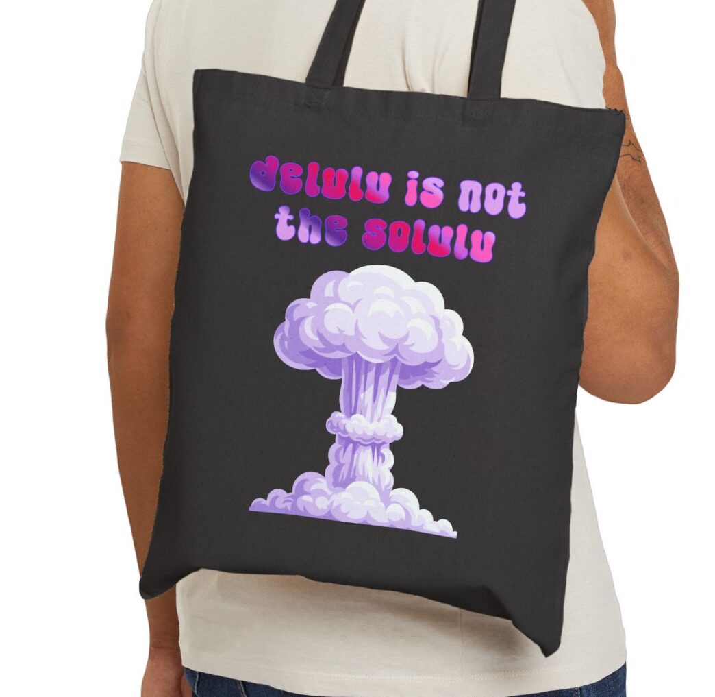 This Delulu Is Not The Solulu cotton canvas tote bag makes a statement for peace in the world. A push back against tyranny and stupid decisions by those who push the wrong buttons. Band together and vote for sanity not madness! Delusion is NOT the solution!