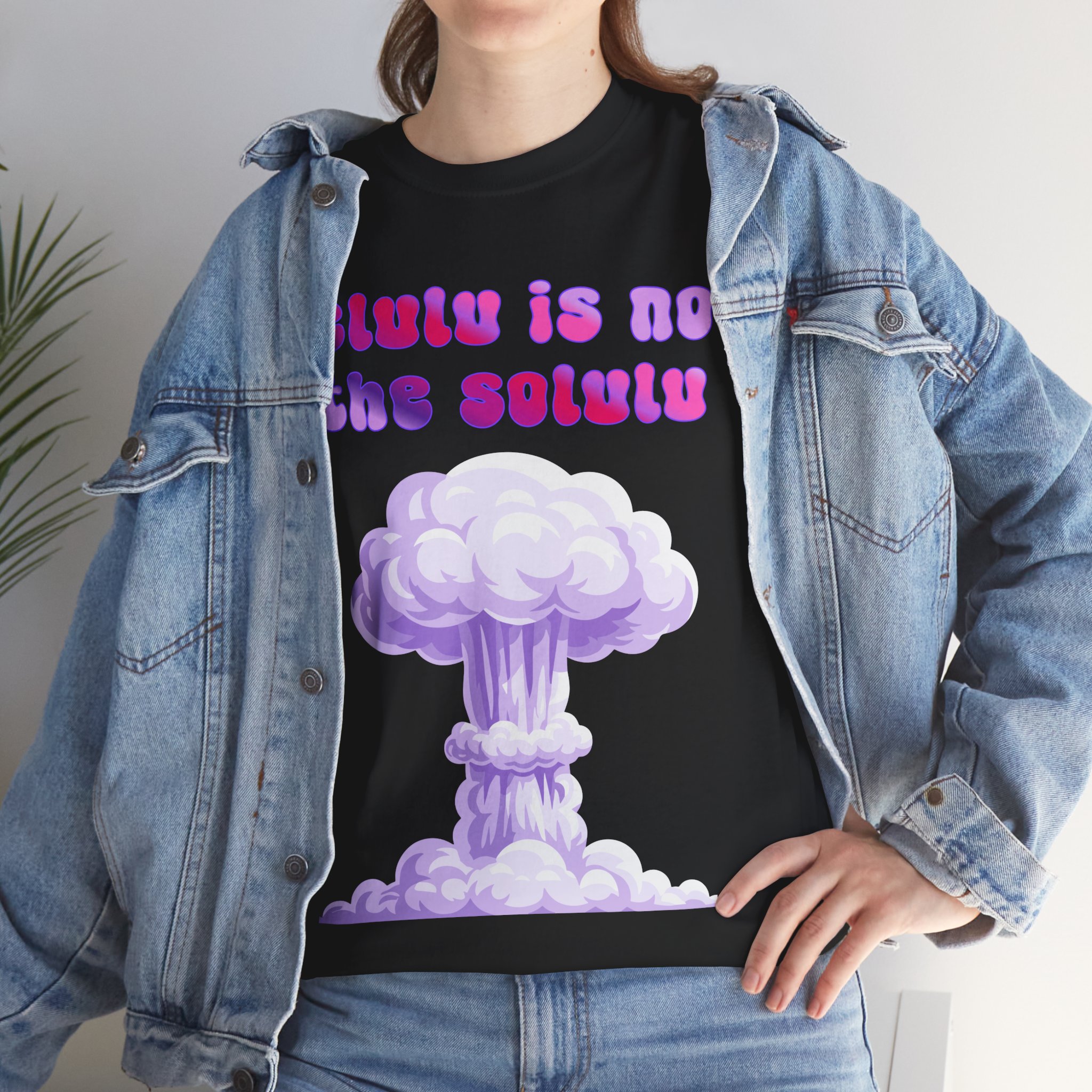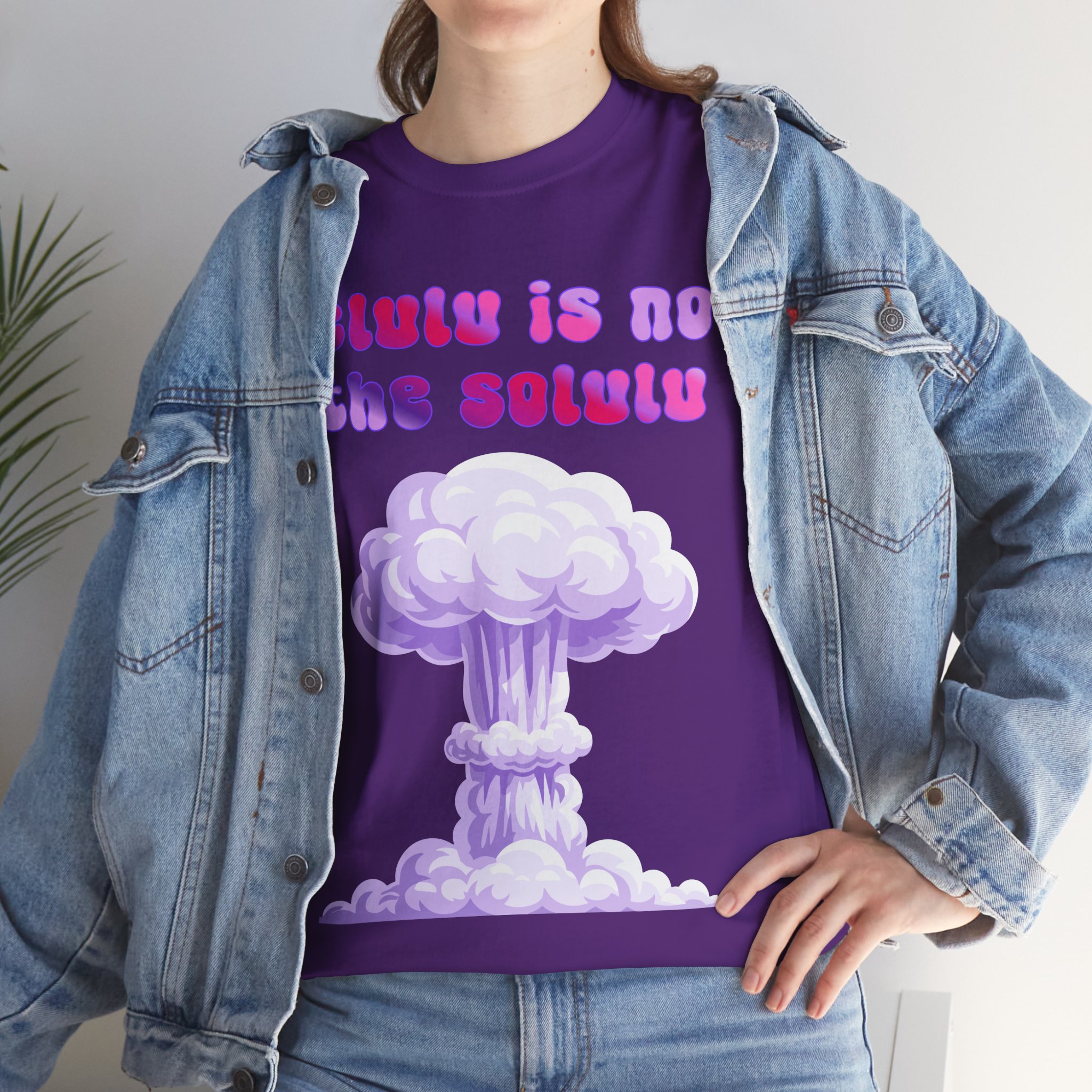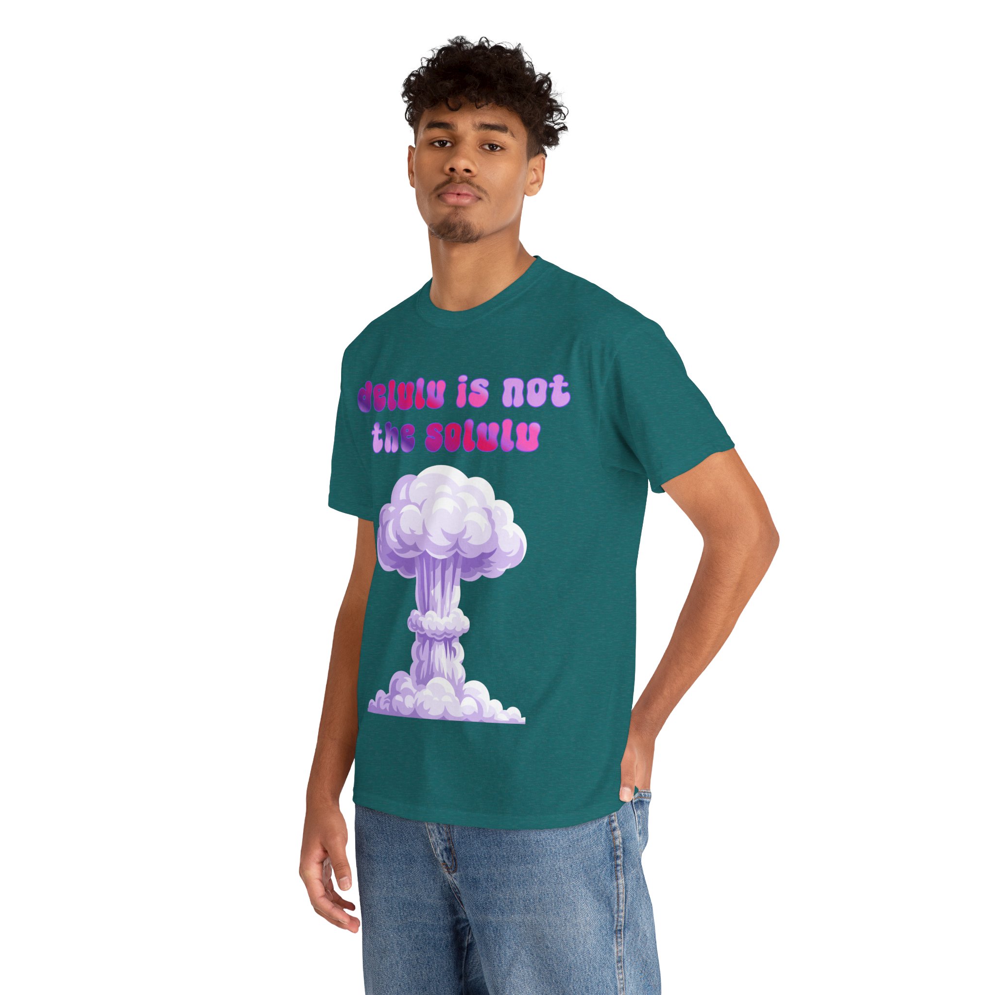 Bold graphic t-shirt features a striking purple explosion design paired with the phrase “delulu is not the solulu”—a reminder that blowing things up (literally or emotionally) isn’t the answer. Instead, this shirt stands for choosing peace, kindness, and calm over chaos. Perfect for anyone who loves meaningful fashion with a touch of humor, this tee turns a viral phrase into a thoughtful message about emotional growth, non-violence, and finding better solutions.