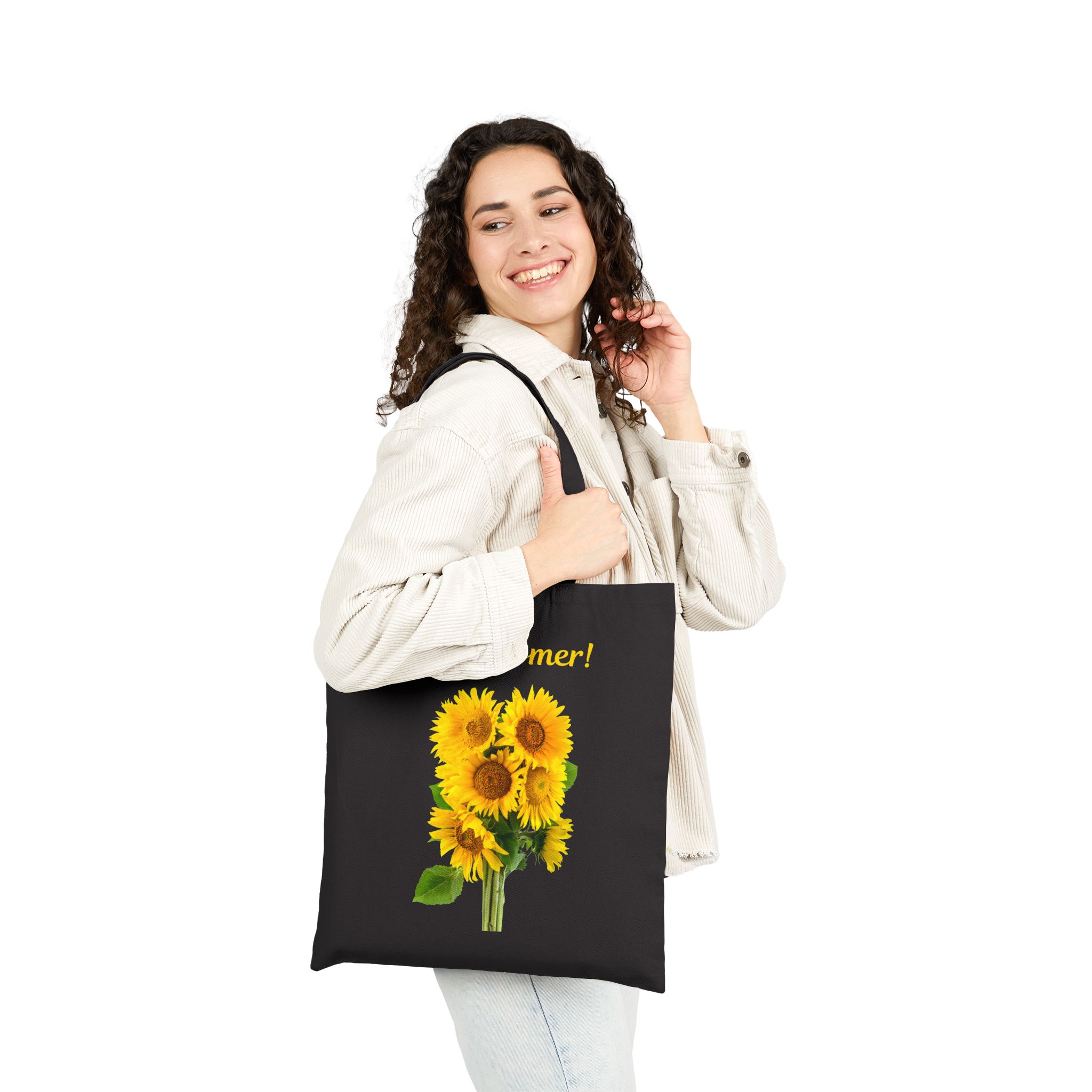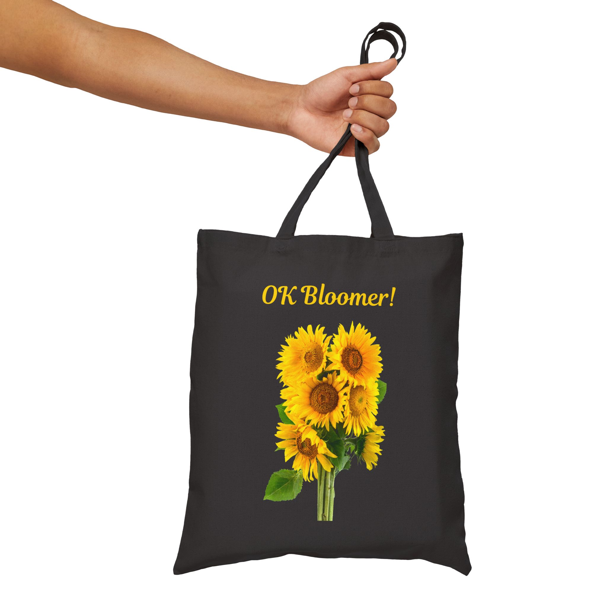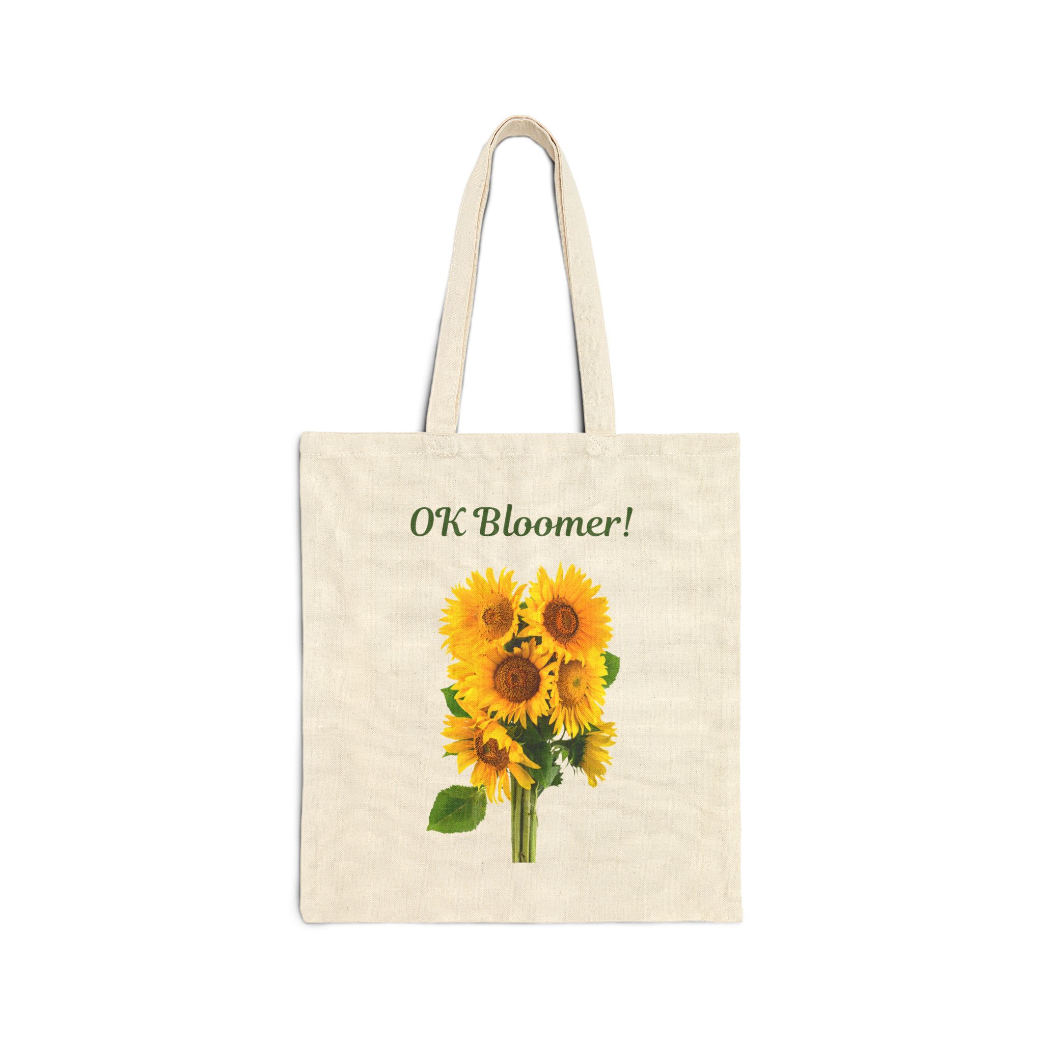 OK Bloomer sunflower tote bag is a funny and positive push back to the annoying dismissive OK Boomer meme. Encourage connection between all generations with this bright sunflowers cotton canvas tote available in natural or black colours. With a wry smile and enough room for groceries, books, or a weekend market haul this bag will brighten your day! The heavyweight canvas holds its shape and the reinforced handles stand up to daily use — from commute clutter to farmer’s-market finds.