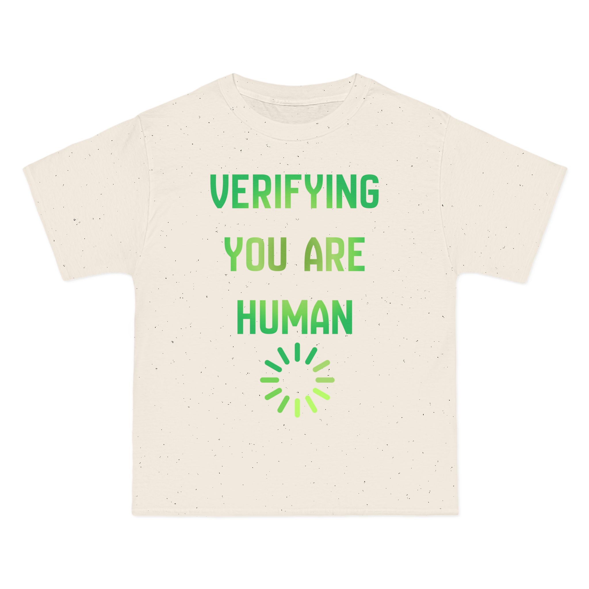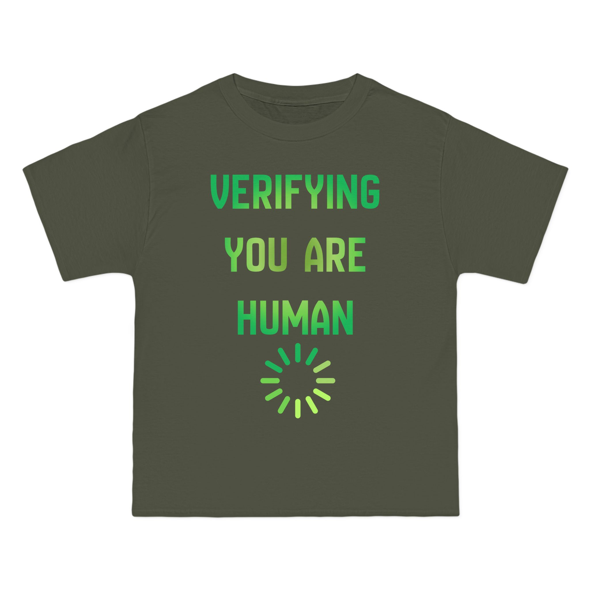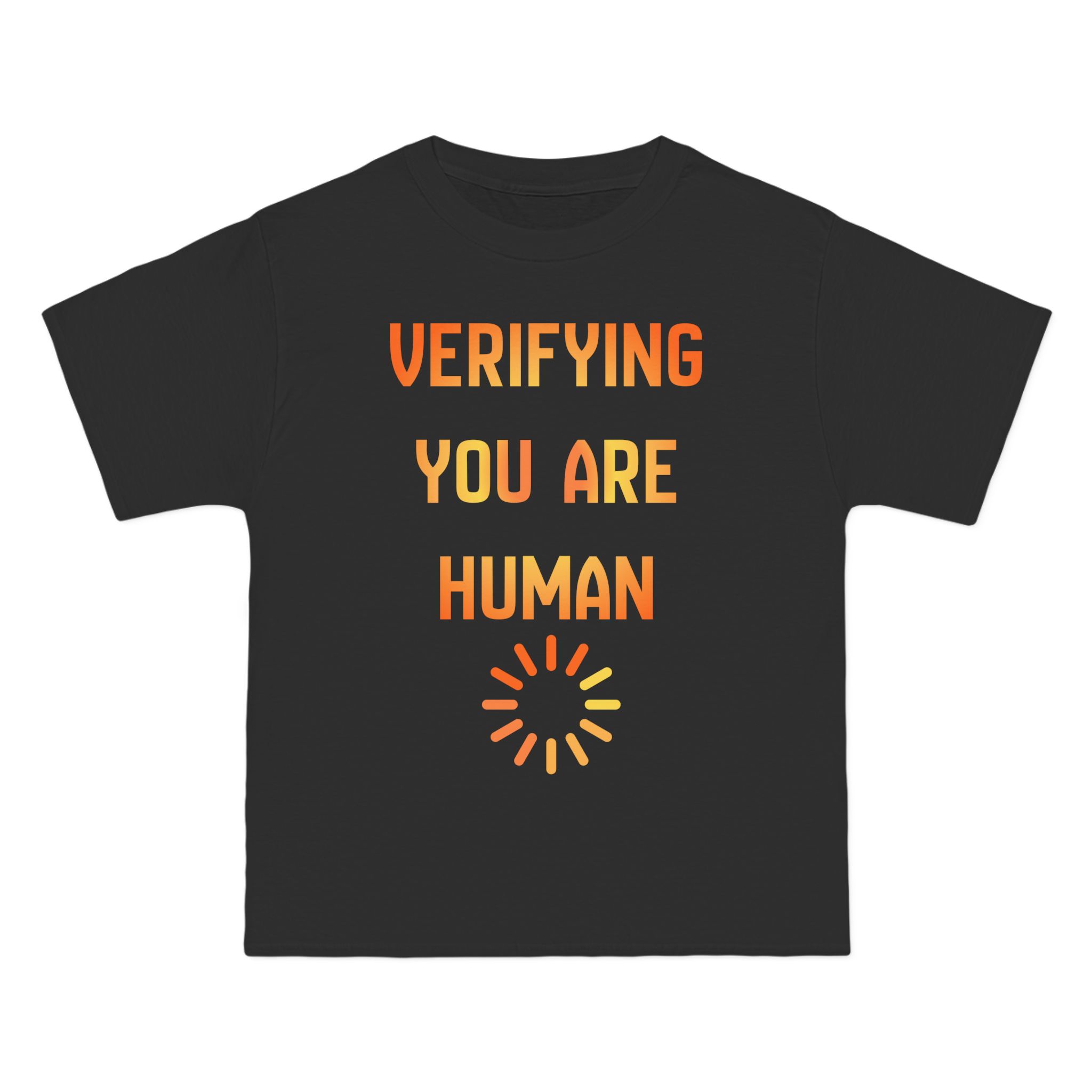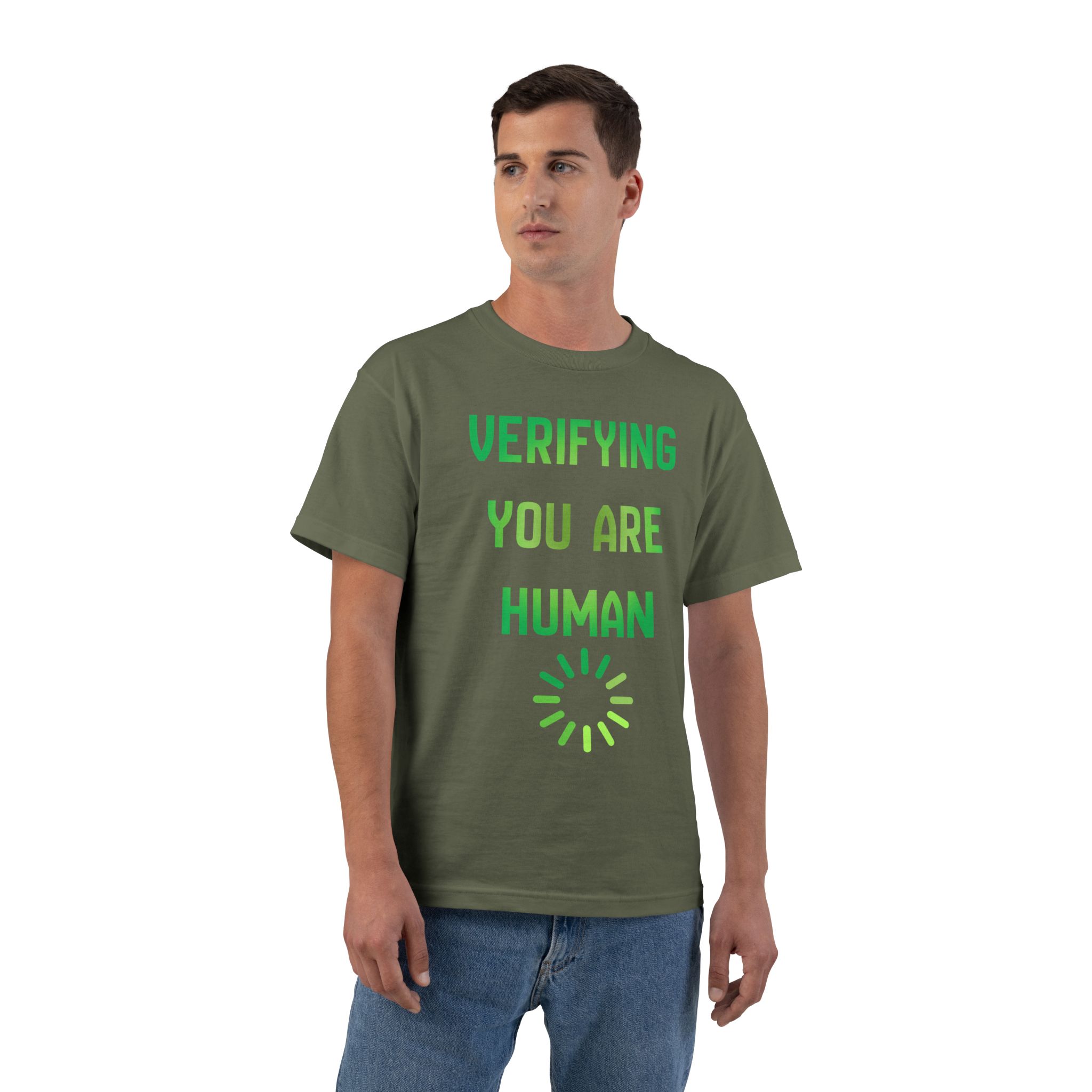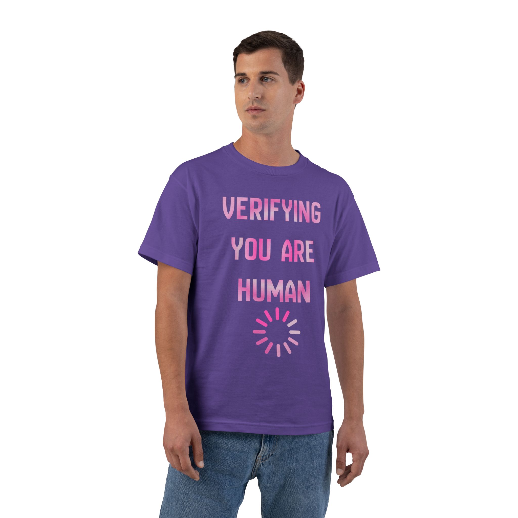 Funny quirky T Shirt with ‘Verifying You Are Human’ text and graphic. A soft, mid-weight tee that speaks to internet humor and everyday relatability. The relaxed cut and sturdy cotton weave make this shirt comfortable for long days—whether you’re coding, scrolling, or grabbing coffee. The front features a clean, minimal typographic design with a playful loading icon that reads “VERIFYING YOU ARE HUMAN,” a quiet nod to anyone who’s ever replied to a captcha or laughed at modern digital absurdities. It sits naturally on the body and holds its shape after washes thanks to shoulder taping and a lay-flat collar. Wear it at casual meetups, remote-work sessions, tech gatherings, or lazy weekends—this tee feels familiar, funny, and just the right amount of clever. Product features – 100% cotton for most solid colors; select shades include polyester blends – Medium-weight 6.1 oz fabric for durability and comfortable structure – Relaxed fit with shoulder taping and lay-flat collar to maintain shape – Double-needle stitched sleeves and hem for long-lasting wear – Black sewn-in label and smooth print-ready surface Care instructions – Machine wash: cold (max 30C or 90F) – Non-chlorine: bleach as needed – Tumble dry: low heat – Iron, steam or dry: low heat – Do not dryclean