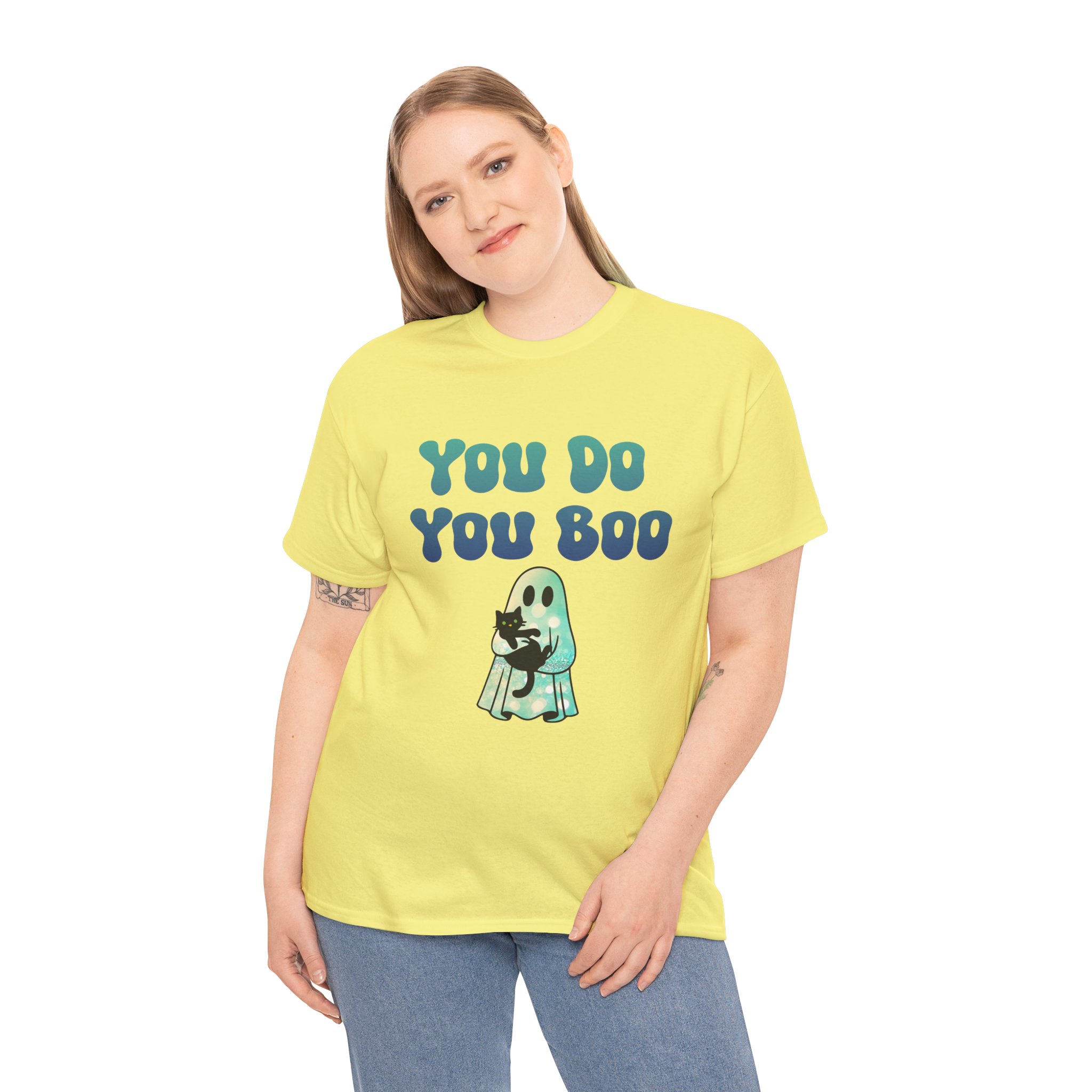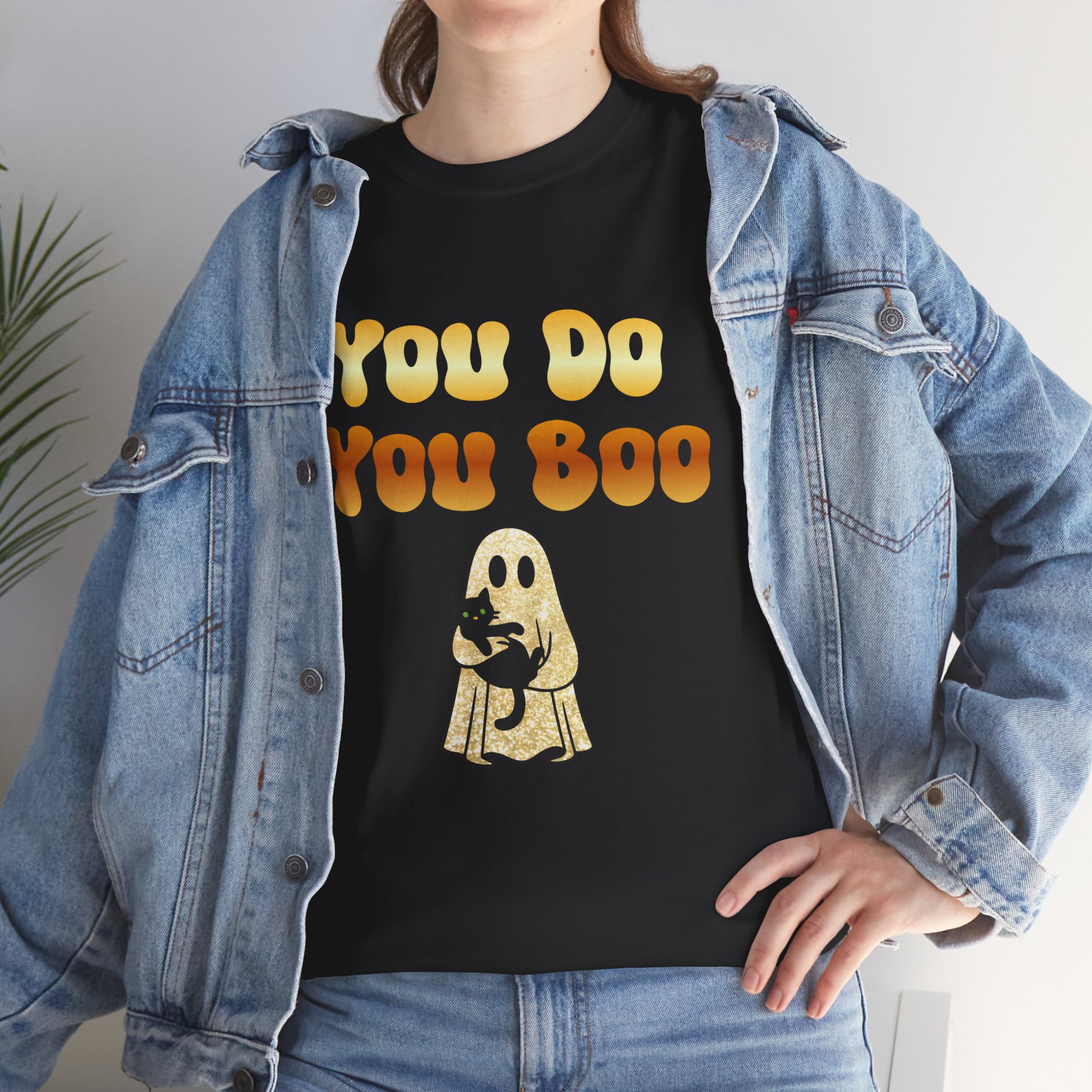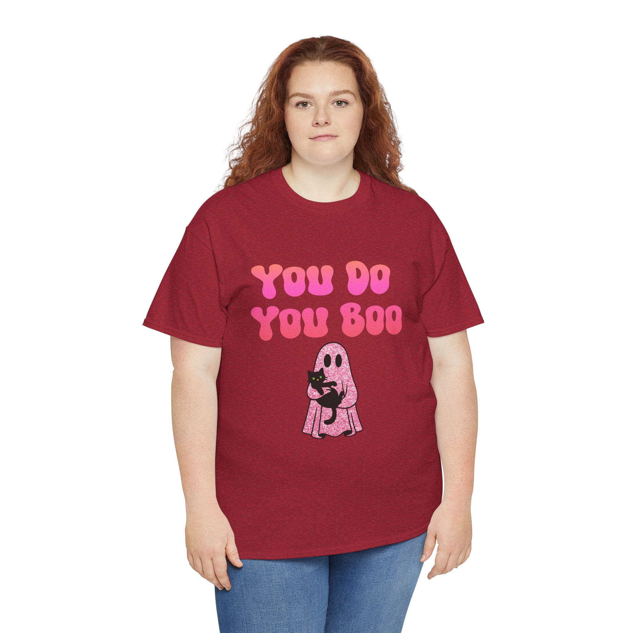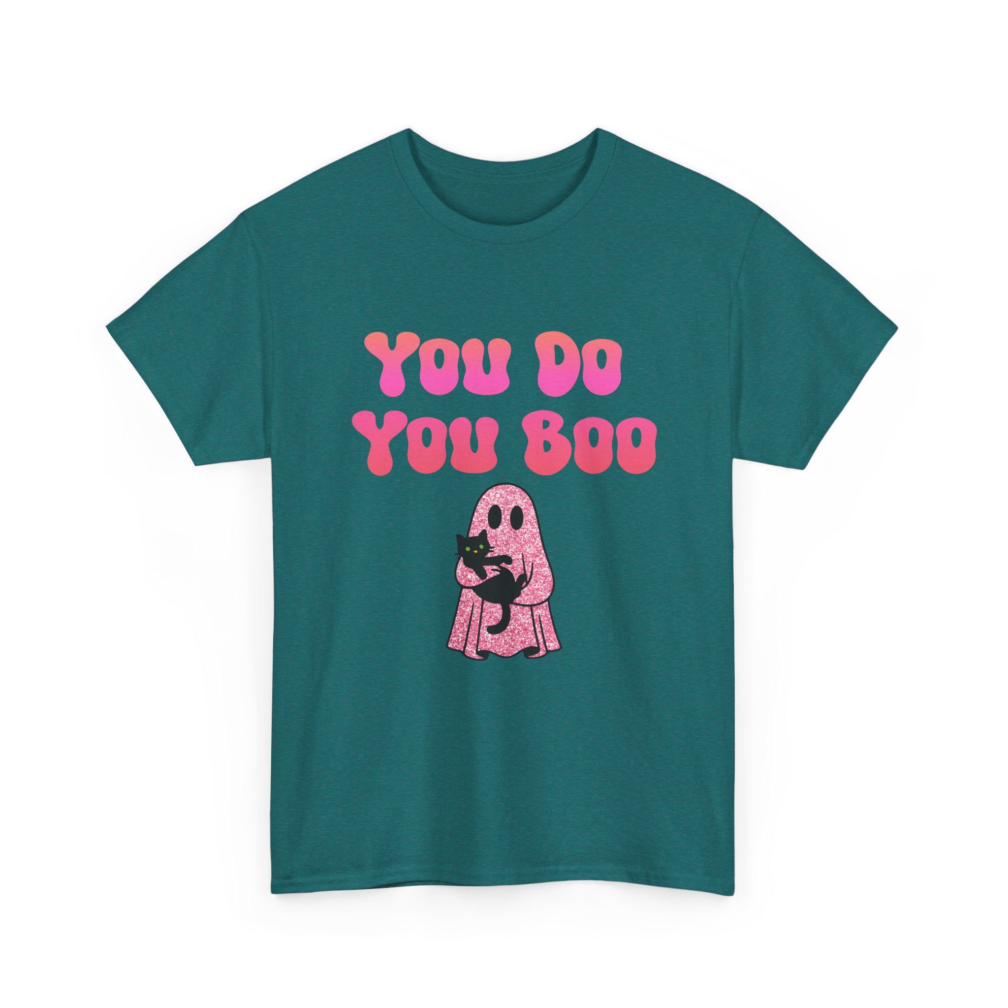 You Do You Boo funny unisex T Shirt with a playful, confident vibe. Bold bubble lettering reads “YOU DO YOU BOO” above a cute ghost holding a black cat—printed in bright colours that pop on a range of T Shirt colours. The shirt sits relaxed at the shoulders with a classic crew neckline and a comfortable midweight feel, so it moves with you throughout the day. It reads like a small, wearable pep talk: equal parts cute and sassy, meant to brighten your mood or someone else’s. Wear it with jeans, a denim jacket, or shorts; let the graphic do the talking while you go about your day with a little extra swagger.