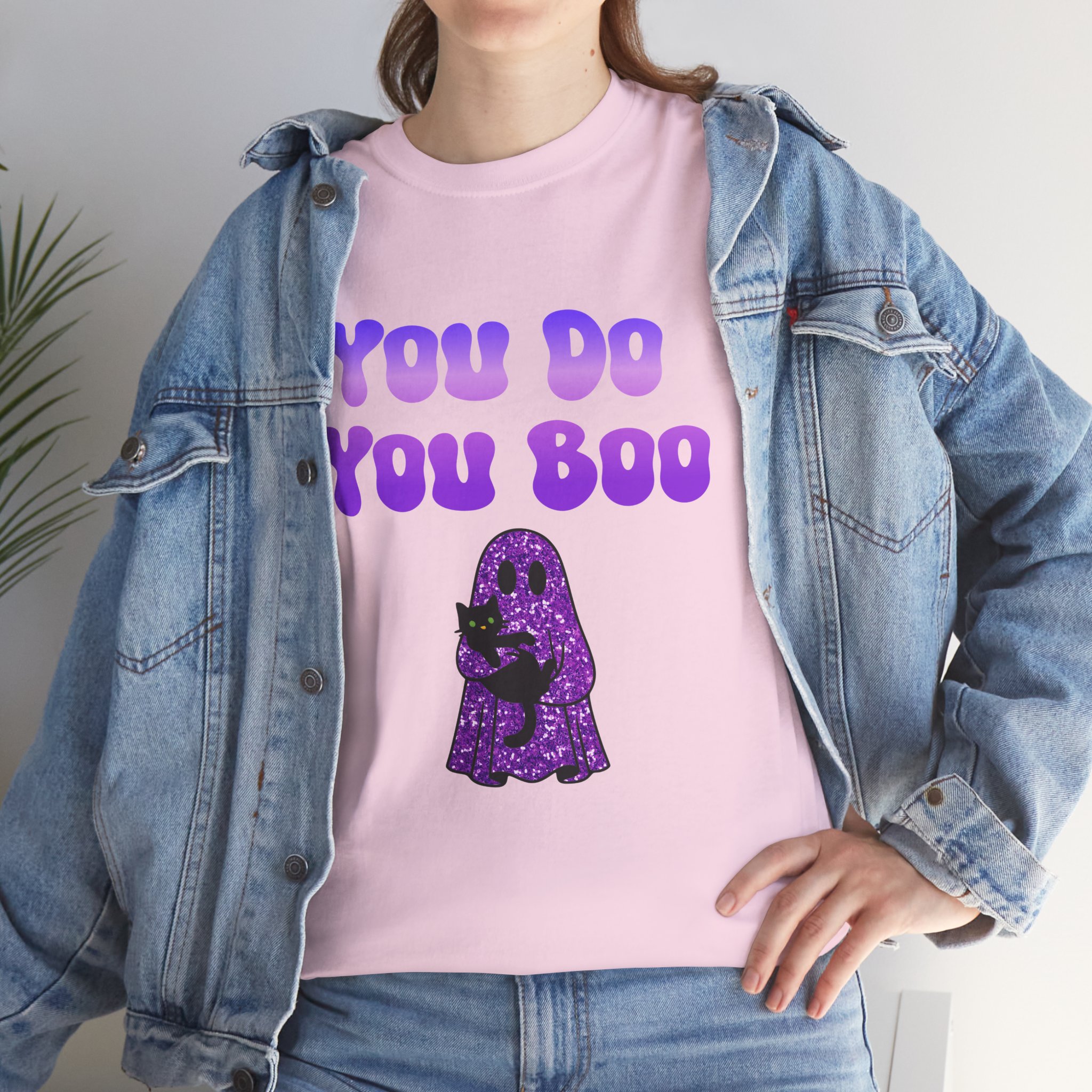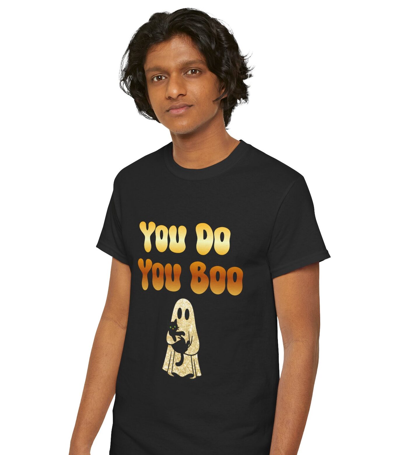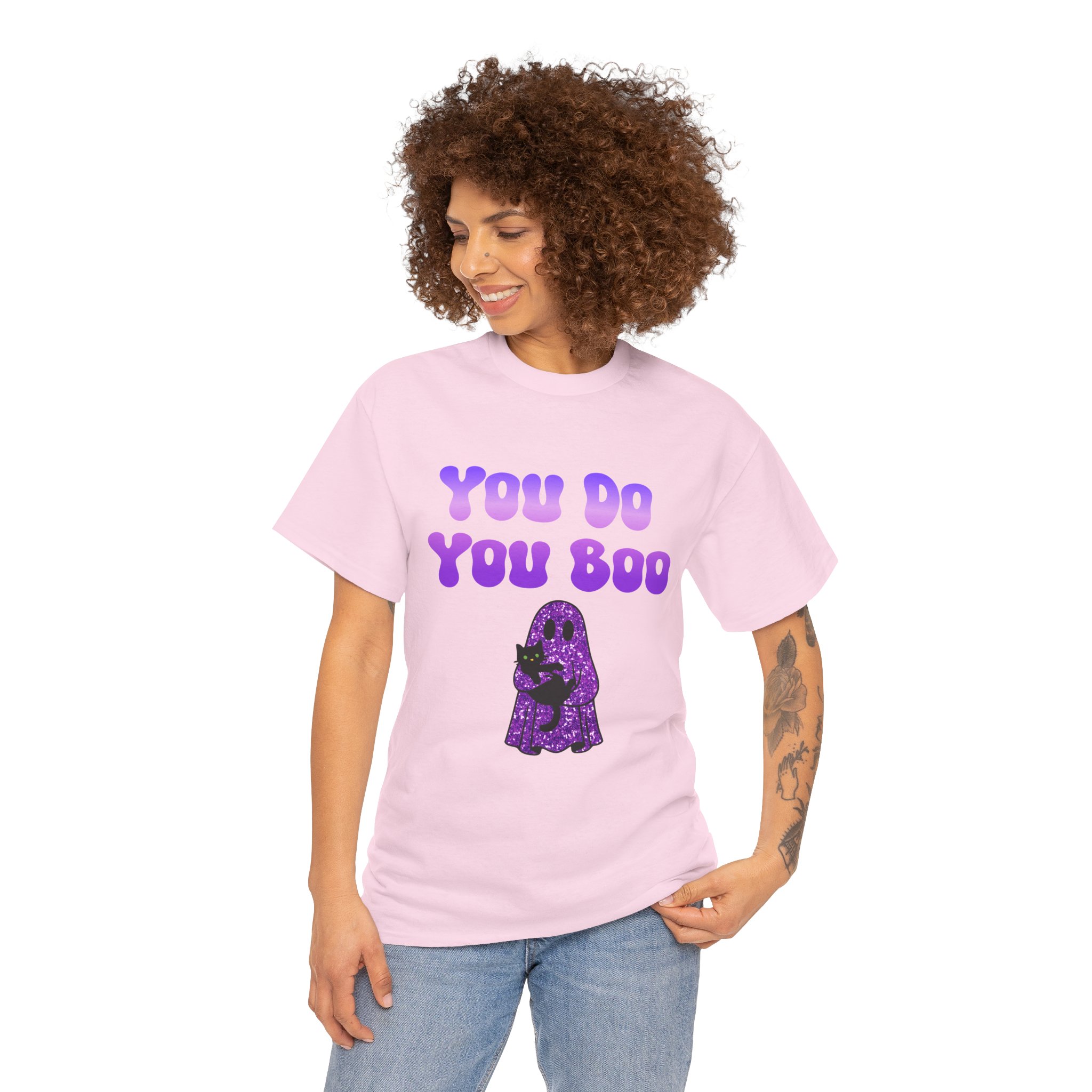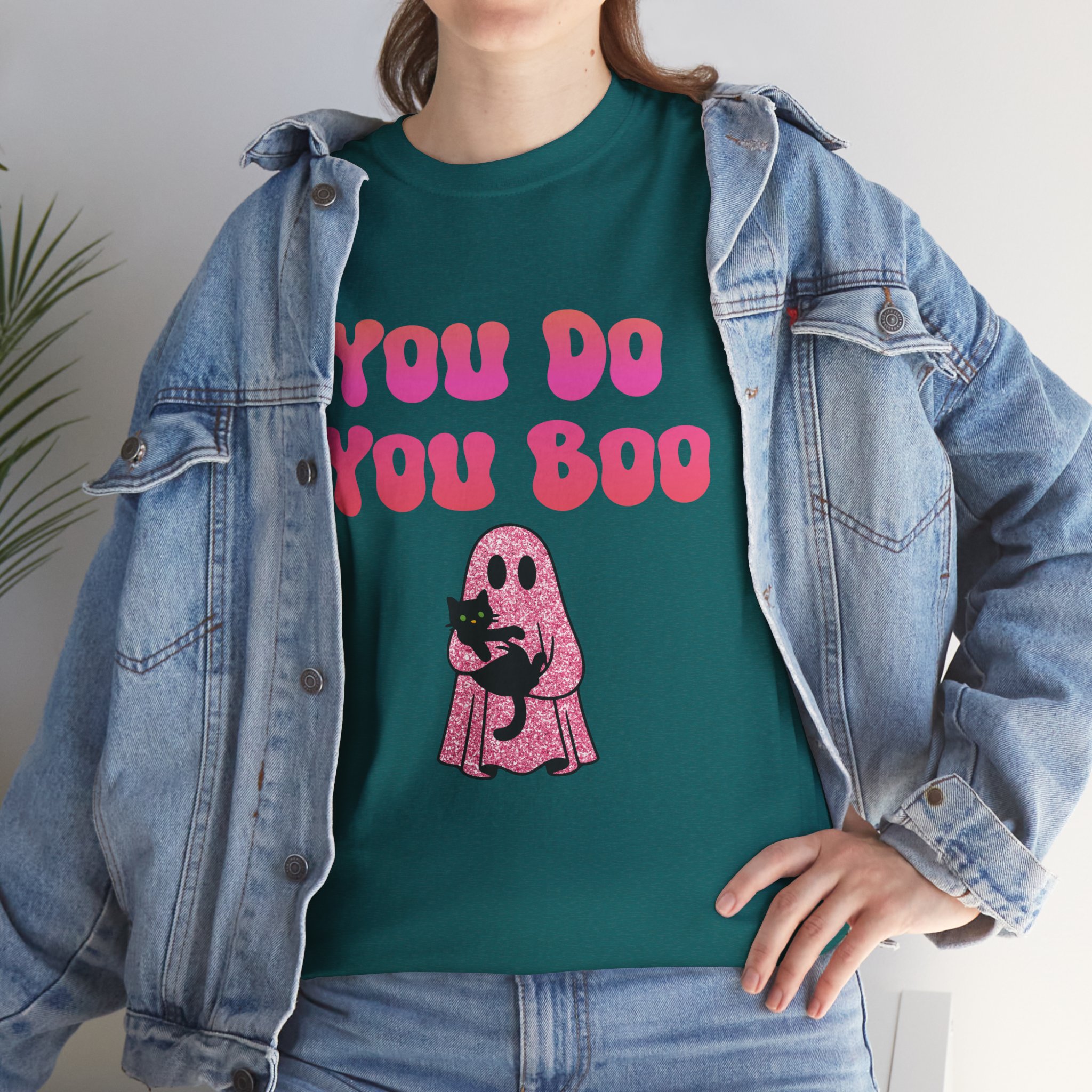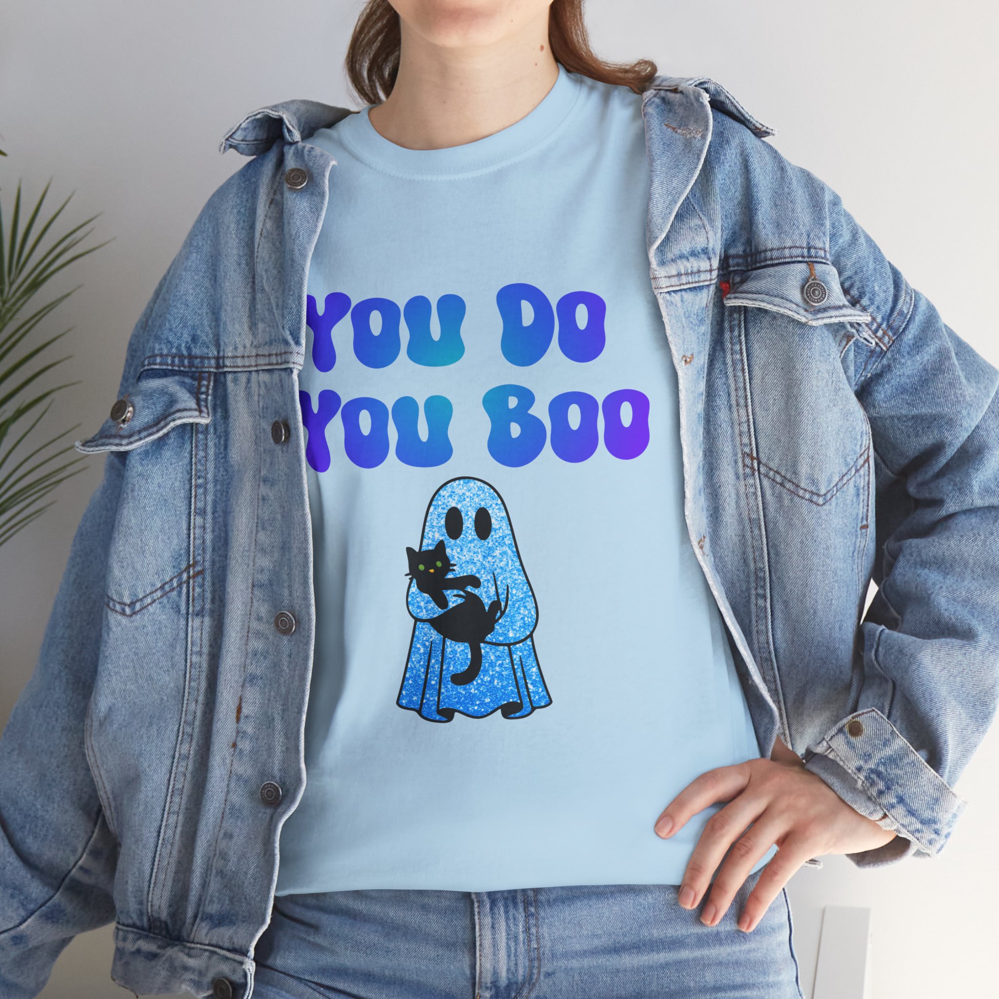 You Do You Boo funny unisex T Shirt with a playful, confident vibe. Bold bubble lettering reads “YOU DO YOU BOO” above a cute ghost holding a black cat—printed in bright colours that pop on a range of T Shirt colours. The shirt sits relaxed at the shoulders with a classic crew neckline and a comfortable midweight feel, so it moves with you throughout the day. It reads like a small, wearable pep talk: equal parts cute and sassy, meant to brighten your mood or someone else’s. Wear it with jeans, a denim jacket, or shorts; let the graphic do the talking while you go about your day with a little extra swagger.